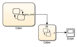 Когда существует несколько широковещательных сообщений вызова функции выходное событие в одном временном шаге, график диспетчеризирует все широковещательные сообщения в том временном шаге. Выполнение подсистем вызова функций чередовано с выполнением графика, так, чтобы выведенный от подсистемы вызова функций сразу было доступно в графике. Например, в этой модели, график Вызывающей стороны использует вызов функции выходное событие output_cmd активировать график Вызываемого.