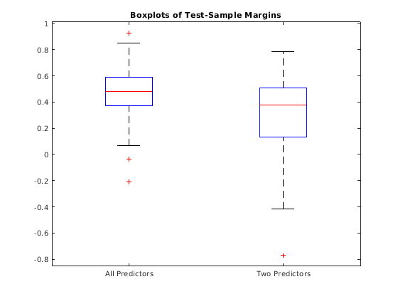 fullMargins = margin(fullMdl,XTest,YTest); partMargins = margin(partMdl,XTest(:,1:2),YTest); boxplot([fullMargins partMargins],'Labels',{'All Predictors','Two Predictors'}) title('Boxplots of Test-Sample Margins')