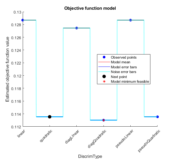 rng(1) Mdl = fitcdiscr(meas,species,'OptimizeHyperparameters','auto',... 'HyperparameterOptimizationOptions',... struct('AcquisitionFunctionName','expected-improvement-plus'))