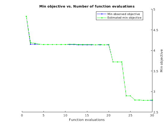 |====================================================================================================================| | Iter | Eval | Objective: | Objective | BestSoFar | BestSoFar | KernelScale | Lambda | Epsilon | | | result | log(1+loss) | runtime | (observed) | (estim.) | | | | |====================================================================================================================| | 21 | Best | 3.7172 | 0.31983 | 3.7172 | 3.7174 | 818.08 | 2.5529e-06 | 2.1058 |
