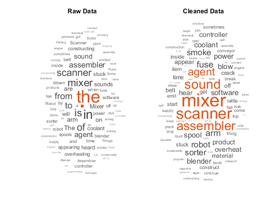 figure subplot(1,2,1) wordcloud(rawBag); title("Raw Data") subplot(1,2,2) wordcloud(cleanedBag); title("Cleaned Data")