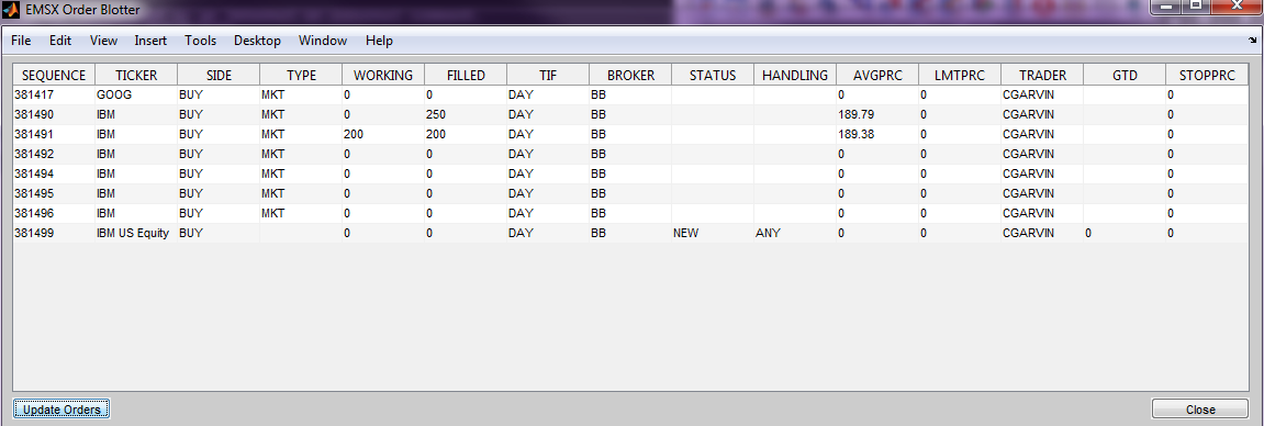 [t,subs] = emsxOrderBlotter(c) отображает информацию для заказа торговца. c связь Bloomberg® EMSX, t объект - таймер, сопоставленный с обработчиком событий и subs список подписок EMSX Bloomberg.