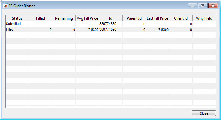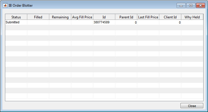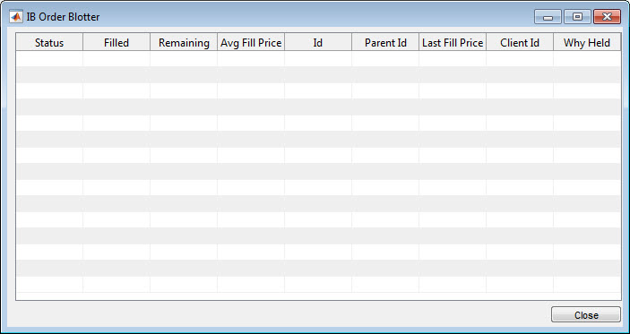 f = findobj('Tag','IBOrderBlotter'); if isempty(f) f = figure('Tag','IBOrderBlotter','MenuBar','none', ... 'NumberTitle','off','Name','IB Order Blotter') pos = f.Position; f.Position = [pos(1) pos(2) 687 335]; colnames = {'Status','Filled','Remaining','Avg Fill Price','Id', ... 'Parent Id','Last Fill Price','Client Id','Why Held'}; data = cell(15,9); uitable(f,'Data',data,'RowName',[],'ColumnName',colnames, ... 'Position',[10 30 677 300],'Tag','OrderDataTable') uicontrol('Style','text','Position',[10 5 592 20], ... 'Tag','IBOrderMessage') uicontrol('Style','pushbutton','String','Close', ... 'Callback','evalin(''base'',''close(ib);close(findobj(''''Tag'''',''''IBOrderBlotter''''));'')',... 'Position',[607 5 80 20]) end