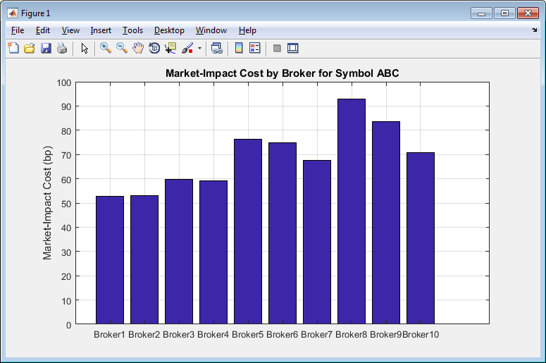% Plot best broker for given stock bar(table2array(BrokerPreTrade(1,:))) set(gca,'XTickLabel',BrokerNames.Broker) ylabel('Market-Impact Cost (bp)') title(['Market-Impact Cost by Broker for Symbol ' ... BrokerPreTrade.Properties.RowNames{1}]) grid