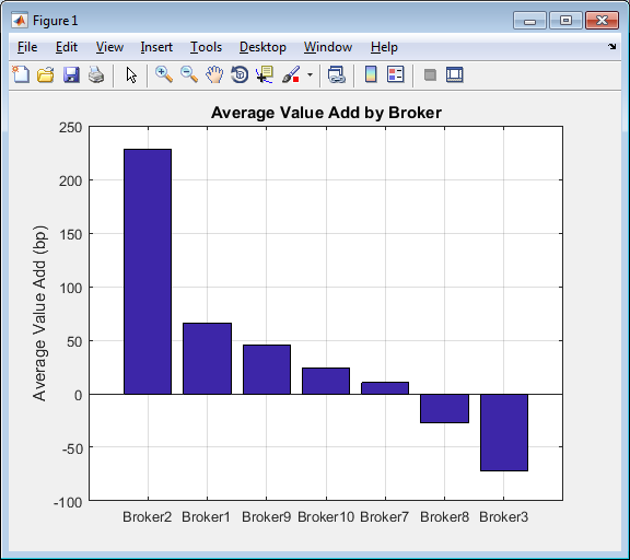 bar(BrokerRankings.AvgValueAdd) set(gca,'XTickLabel',BrokerRankings.Broker) ylabel('Average Value Add (bp)') title('Average Value Add by Broker') grid