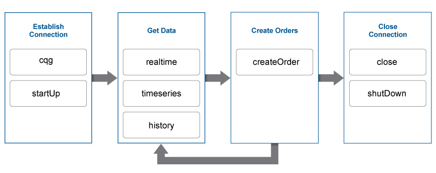 Эта схема показывает функции, которые можно использовать с CQG®, чтобы контролировать информацию о рыночной цене и представить порядки.