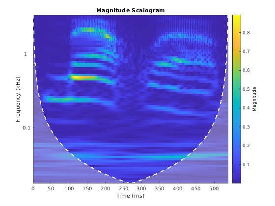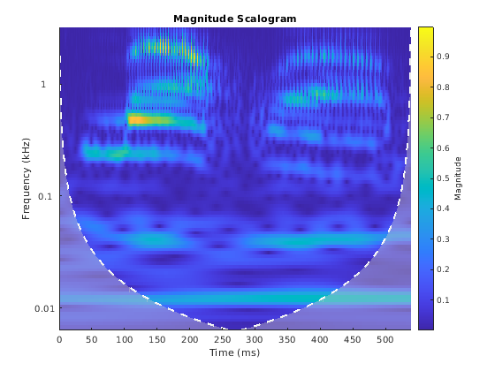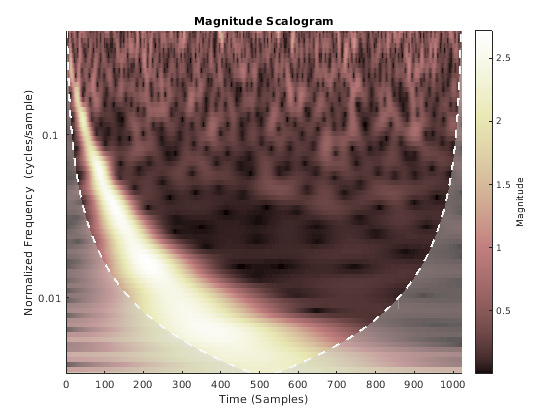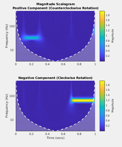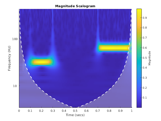 cwt(___) без выходных аргументов строит CWT scalogram. scalogram является абсолютным значением CWT, построенного как функция времени и частоты. Частота построена на логарифмическом масштабе. Конус влияния, показывающего, где краевые эффекты становятся значительными, также построен. Серые области вне пунктирной белой линии формируют рисунок областей, где краевые эффекты являются значительными. Если входной сигнал с комплексным знаком, положительное (против часовой стрелки) и отрицательный (по часовой стрелке), компоненты построены в отдельном scalograms.