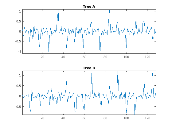 По умолчанию, dualtree использует почти симметричную биоортогональную пару фильтра с длинами 5 (масштабирующий фильтр) и 7 (фильтр вейвлета) для уровня 1 и ортогональной пары фильтра вейвлета К-шифта Гильберта длины 10 для уровней, больше, чем или равный 2.
