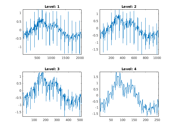 [ возвращает 1D двойной древовидный комплексный вейвлет преобразовывает (DTCWT) A,D] = dualtree(X)X. Выход A матрица итогового уровня с действительным знаком, масштабирующего (lowpass) коэффициенты. Выход D L-by-1 массив ячеек коэффициентов вейвлета с комплексным знаком, где L является уровнем преобразования.