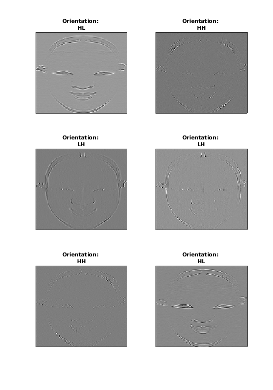 [ возвращает 2D двойной древовидный комплексный вейвлет преобразовывает (DTCWT) A,D] = dualtree2(X)X использование фильтров Q-сдвига Кингсбери. Выход A матрица итогового уровня с действительным знаком, масштабирующего (lowpass) коэффициенты. Выход D L-by-1 массив ячеек коэффициентов вейвлета с комплексным знаком, где L является уровнем преобразования. Для каждого элемента D существует шесть поддиапазонов вейвлета.