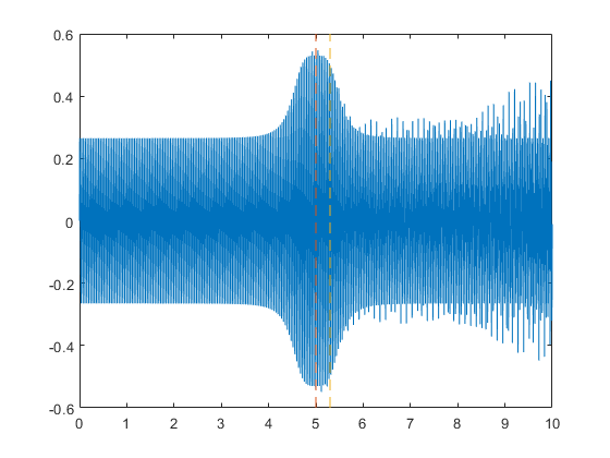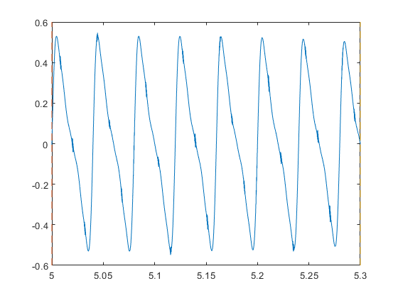 yBPFO = yImpact + yHealthy; xLimLeft = 5.0; xLimRight = 5.3; yMin = -0.6; yMax = 0.6; plot(t,yBPFO) hold on [limLeft,limRight] = meshgrid([xLimLeft xLimRight],[yMin yMax]); plot(limLeft,limRight,'--') hold off