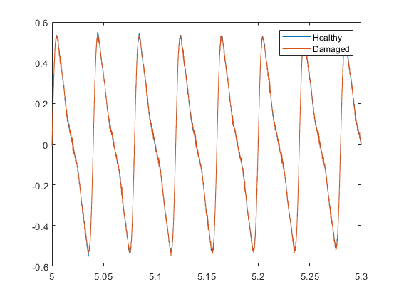 rn = 150; yGood = yHealthy + randn(size(yHealthy))/rn; yBad = yBPFO + randn(size(yHealthy))/rn; plot(t,yGood,t,yBad) xlim([xLimLeft xLimRight]) legend('Healthy','Damaged')
