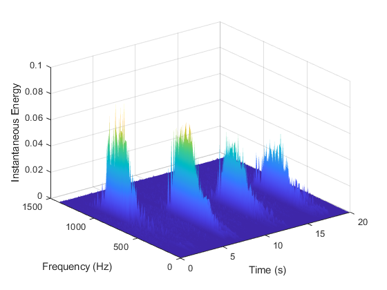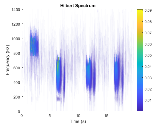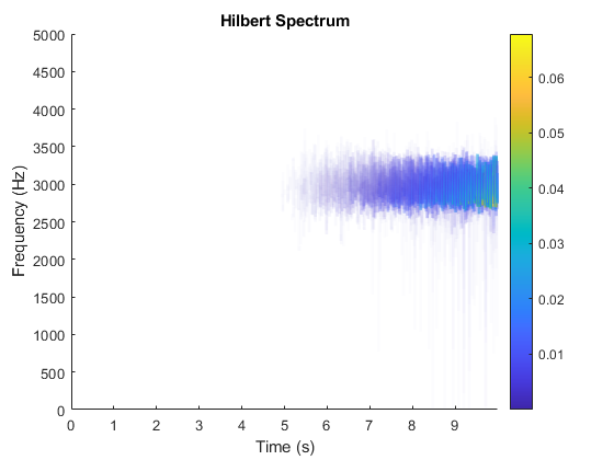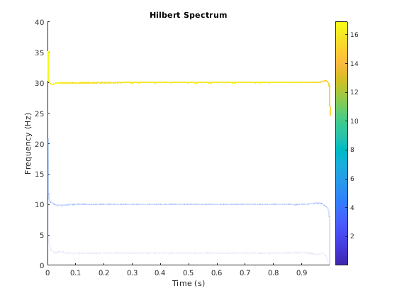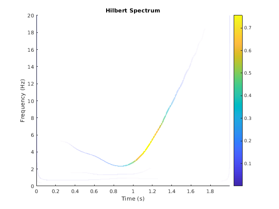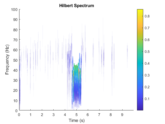 Когда названо без выходных аргументов, hht строит энергию сигнала как функция времени и частоты, с цветом, пропорциональным амплитуде.
