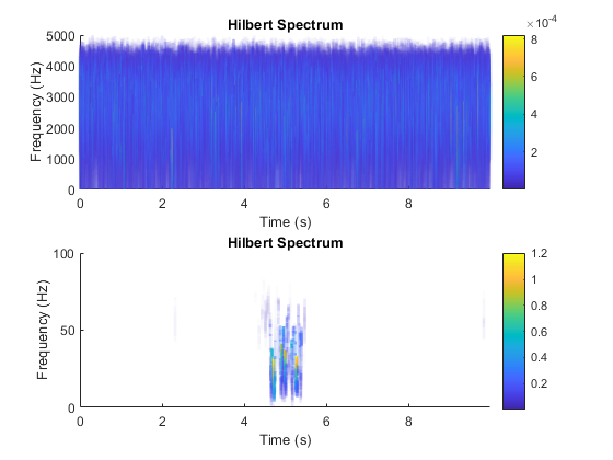 hht(___, строит Гильбертов спектр с дополнительным freqlocation)freqlocation аргумент, чтобы задать местоположение оси частоты. Частота представлена на y - ось по умолчанию.