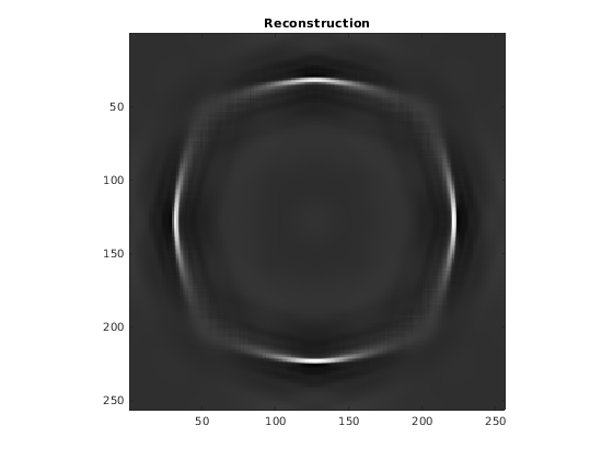 Восстановите изображение с помощью нового содействующего массива. Поскольку единственные ненулевые shearlet коэффициенты - те, которые соответствуют нулевому сдвигу, горизонтальные и вертикальные фрагменты круга подчеркнуты в реконструкции.