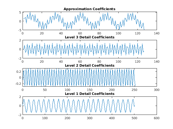 [ возвращает разложение вейвлета 1D c,l] = wavedec(x,n,wname)x сигнала на уровне n использование вейвлета wname. Выходная структура разложения состоит из вектора разложения вейвлета c и бухгалтерский векторный l, который содержит количество коэффициентов уровнем.