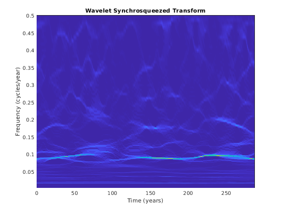 возвращается вейвлет synchrosqueezed преобразовывают, sst = wsst(x)sst, который вы используете, чтобы исследовать данные в плоскости частоты времени. synchrosqueezed преобразовывают, уменьшал энергетическое смазывание, когда по сравнению с непрерывным вейвлетом преобразовывают. Вход, x, должен быть 1D сигнал с действительным знаком по крайней мере с четырьмя выборками. wsst вычисляет synchrosqueezed, преобразовывают использование аналитического вейвлета Morlet.