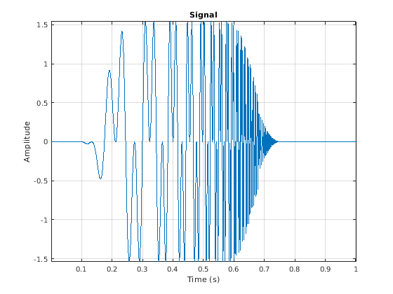 load hychirp plot(t,hychirp) grid on title('Signal') axis tight xlabel('Time (s)') ylabel('Amplitude')
