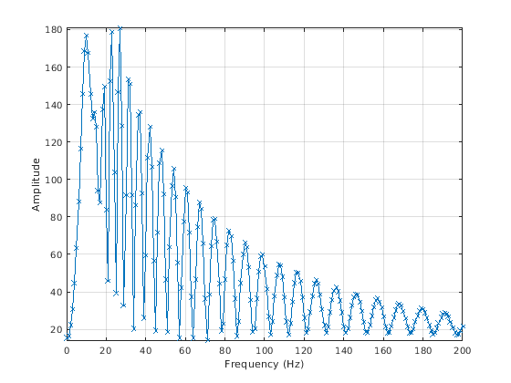 sigLen = numel(hychirp); fchirp = fft(hychirp); fr = Fs*(0:1/Fs:1-1/Fs); plot(fr(1:sigLen/2),abs(fchirp(1:sigLen/2)),'x-') xlabel('Frequency (Hz)') ylabel('Amplitude') axis tight grid on xlim([0 200])