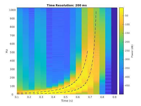 function helperPlotSpectrogram(sig,t,Fs,timeres) % This function is only intended to support this wavelet example. % It may change or be removed in a future release. [px,fx,tx] = pspectrum(sig,Fs,'spectrogram','TimeResolution',timeres/1000); hp = pcolor(tx,fx,20*log10(abs(px))); hp.EdgeAlpha = 0; ylims = hp.Parent.YLim; yticks = hp.Parent.YTick; cl = colorbar; cl.Label.String = 'Power (dB)'; axis tight hold on title(['Time Resolution: ',num2str(timeres),' ms']) xlabel('Time (s)') ylabel('Hz'); dt = 1/Fs; idxbegin = round(0.1/dt); idxend1 = round(0.68/dt); idxend2 = round(0.75/dt); instfreq1 = abs((15*pi)./(0.8-t).^2)./(2*pi); instfreq2 = abs((5*pi)./(0.8-t).^2)./(2*pi); plot(t(idxbegin:idxend1),(instfreq1(idxbegin:idxend1)),'k--'); hold on; plot(t(idxbegin:idxend2),(instfreq2(idxbegin:idxend2)),'k--'); ylim(ylims); hp.Parent.YTick = yticks; hp.Parent.YTickLabels = yticks; hold off end