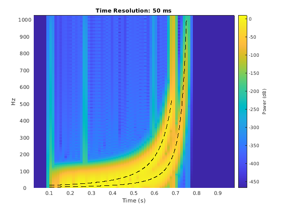 Теперь используйте helperPlotSpectrogram построить спектрограмму с размером окна времени 50 миллисекунд. Более высокие частоты, которые возникают позже в сигнале, теперь разрешены, но более низкие частоты в начале сигнала не.
