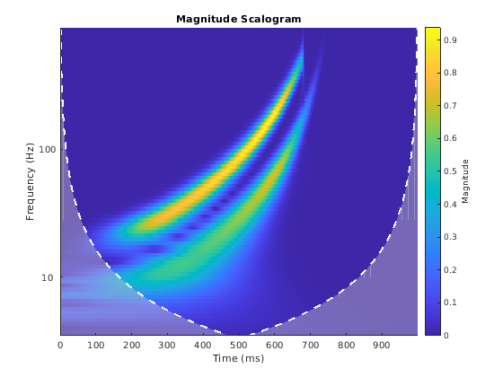 Белая пунктирная линия отмечает то, что известно как конус влияния. Конус влияния показывает области в scalogram, потенциально затронутом граничными эффектами. Для получения дополнительной информации смотрите Граничные эффекты и Конус Влияния.