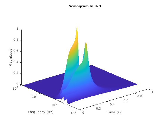 Чтобы получить смысл того, как быстро величина коэффициентов вейвлета растет, используйте функцию помощника helperPlotScalogram3d построить scalogram как 3-D поверхность. Исходный код для helperPlotScalogram3d перечислен в приложении.