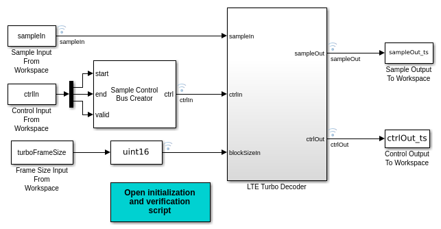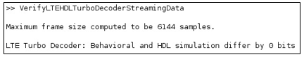 Можно использовать скрипт MATLAB VerifyLTEHDLTurboDecoderStreamingData.m, чтобы запустить MATLAB поведенческий код, настроить, импортировать данные и запустить модель Simulink™, экспортировать данные и сравнить поведенческий выход и Simulink выход.