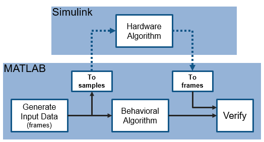 LTE Toolbox™ и функции 5G Toolbox™ операции модели на обрамленном, целочисленных данных с плавающей точкой и обеспечивают превосходные поведенческие ссылки. Аппаратные проекты должны использовать булевскую переменную потоковой передачи или данные фиксированной точки. Этот пример преобразует системы координат в выборки в MATLAB и импортирует демонстрационный поток к Simulink® для аппаратного проекта алгоритма. Те же данные применяются и к аппаратному алгоритму в Simulink и к поведенческому алгоритму в MATLAB. Выходной демонстрационный поток от симуляции Simulink экспортируется в MATLAB и затем преобразовал назад в обрамленные данные для сравнения.