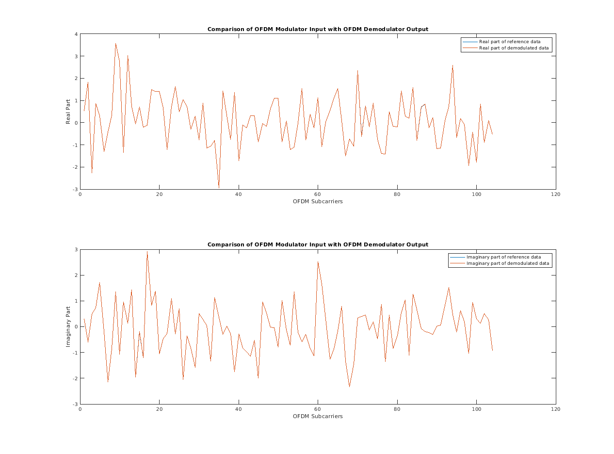 Блок принимает входные данные наряду с допустимым управляющим сигналом и этими параметрами OFDM: длина БПФ, длина CP и количество правых и левых защитных поднесущих. Блок выходные параметры модулировал данные наряду с допустимыми и готовыми сигналами средств управления. Блок производит соответствующие параметры OFDM только, когда портом ready является 1 (высоко) и первым портом valid каждого символа OFDM является 1 (высоко).