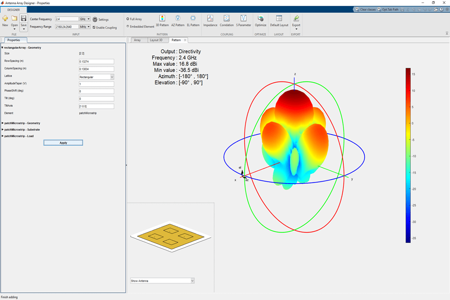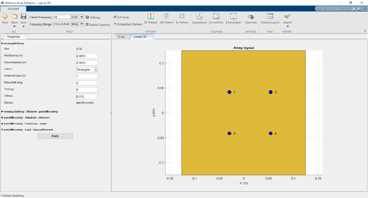 Наблюдайте прямоугольный массив микрополосковой антенны закрашенной фигуры и размещение геометрии на уровне 2,4 ГГц в Массиве и Размещение 3D вкладки фигуры.