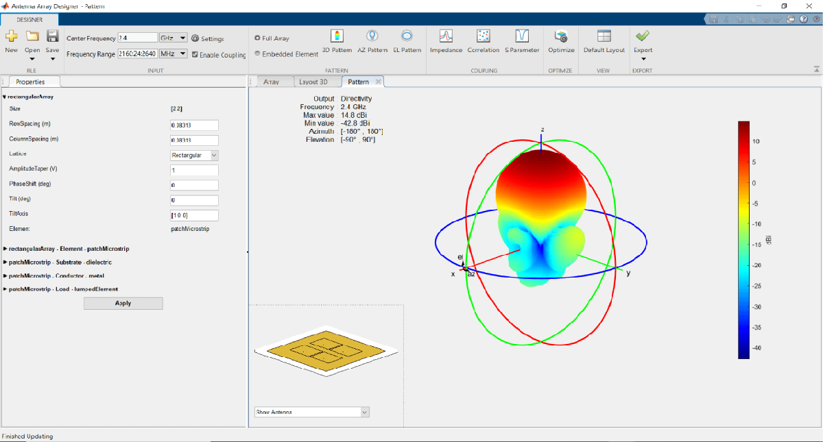 В панели инструментов, под разделом PATTERN, 3-D Шаблон нажатия кнопки, чтобы визуализировать диаграмму направленности. Максимальное усиление массива является 14.8 dBi.