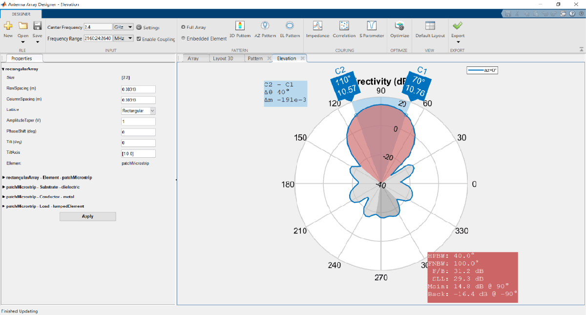 В этом примере установите флажки соответствующий to RowSpacing и ColoumnSpacing под rectangularArray-геометрией и GroundPlaneLength и GroundPlaneWidth под patchMicrostrip - Геометрия.