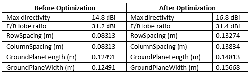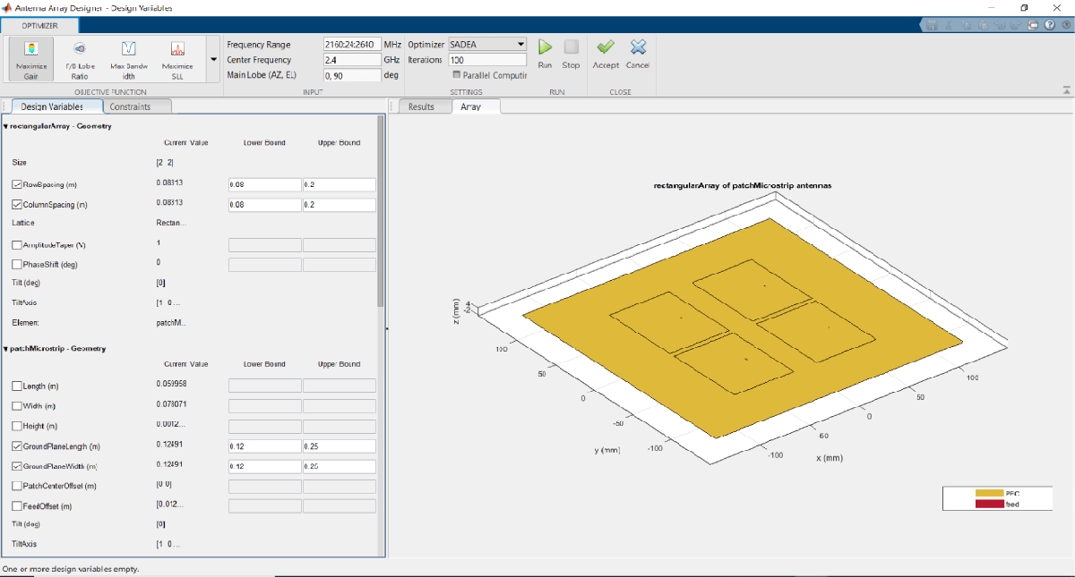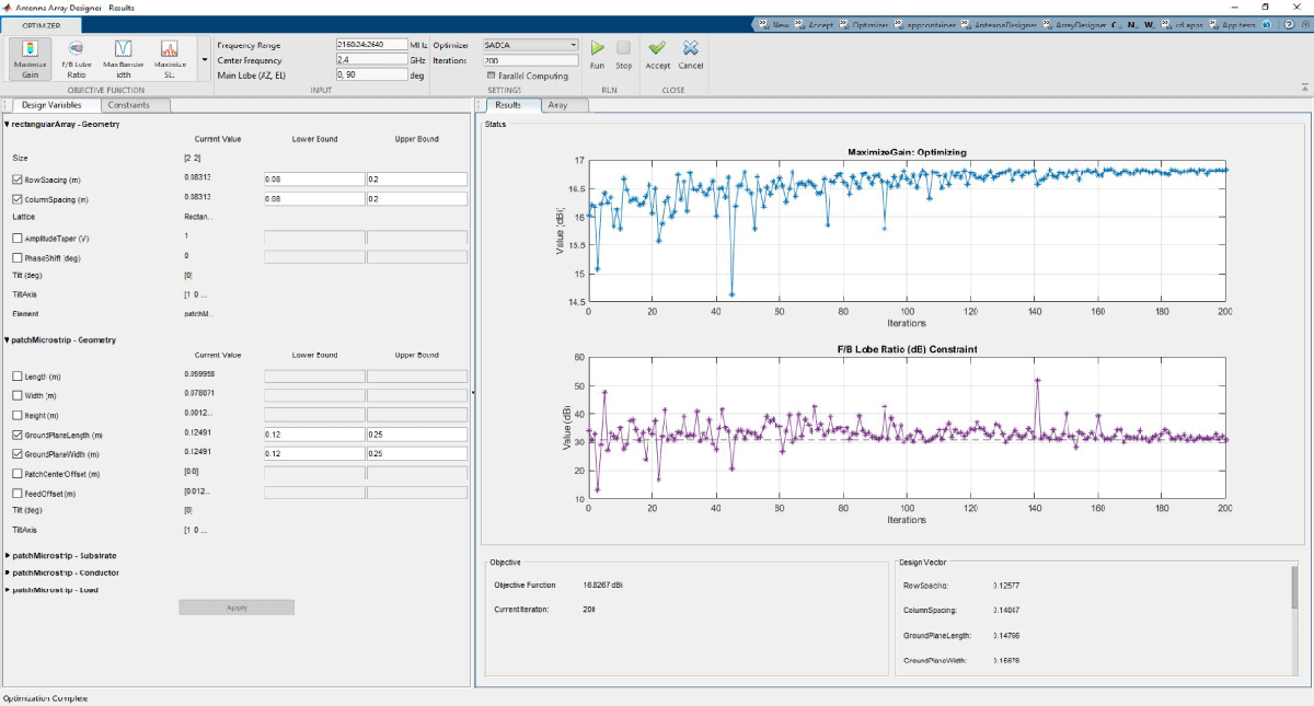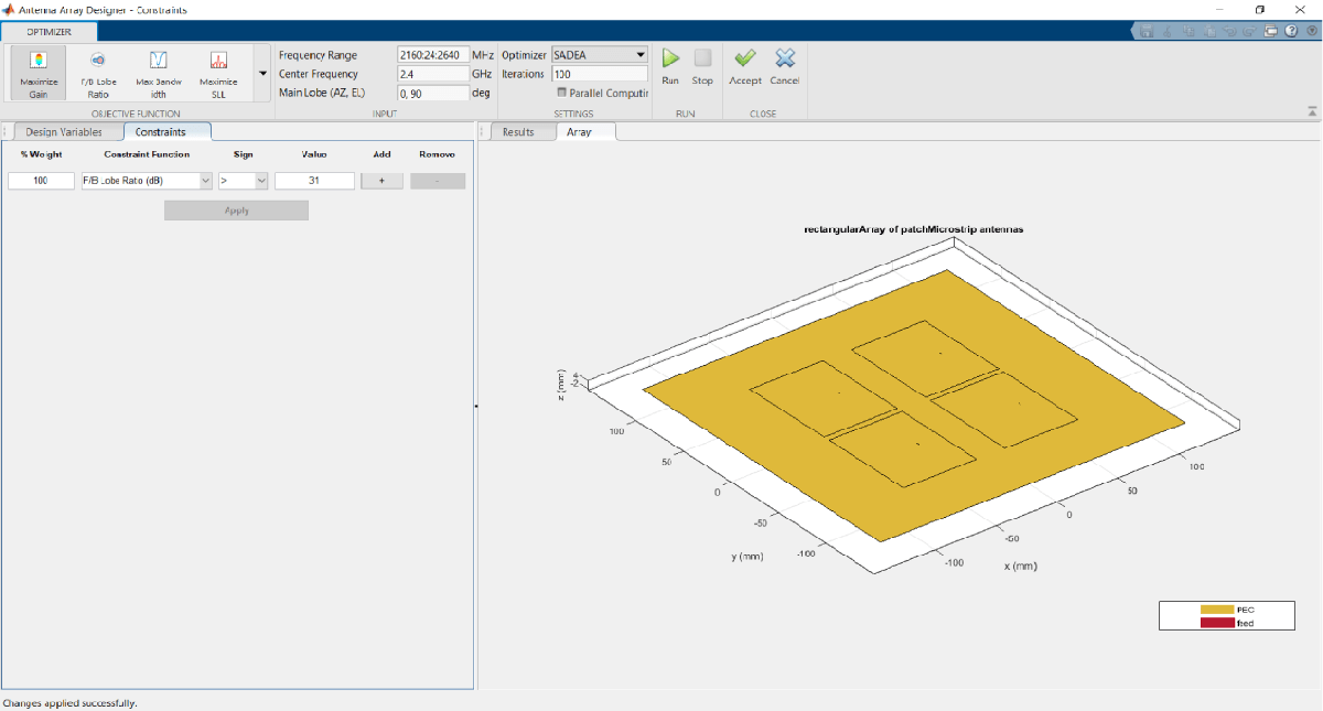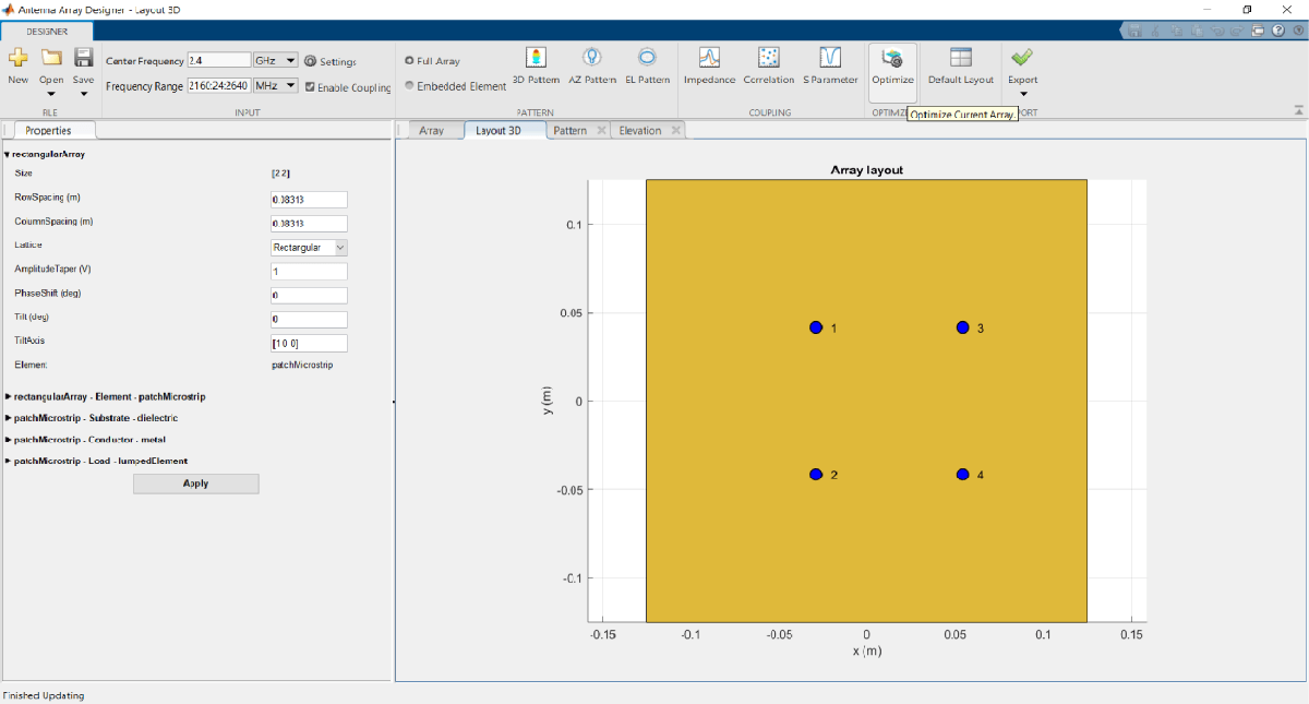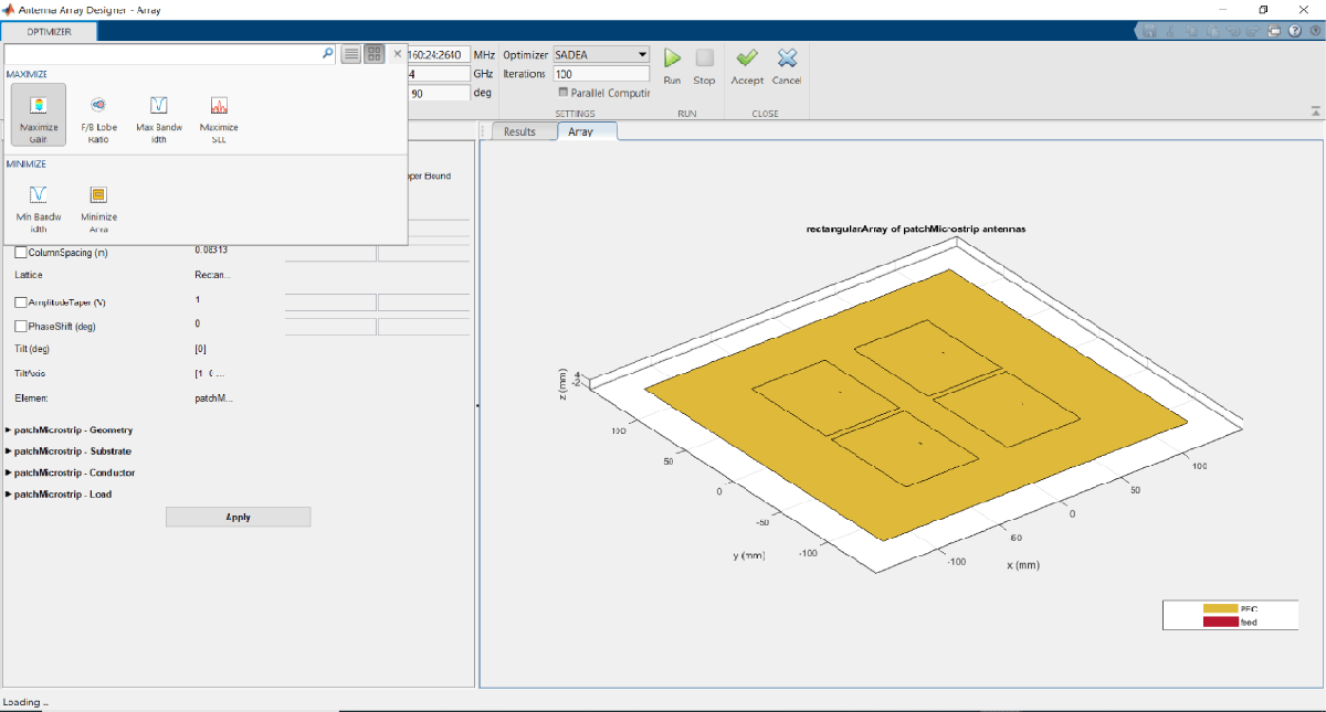 Чтобы оптимизировать прямоугольную антенну закрашенной фигуры массивов, нажмите Optimize под разделом Optimize.