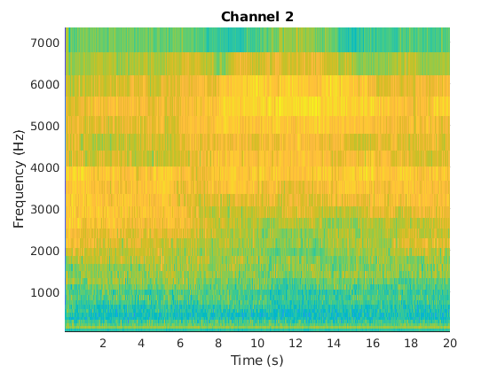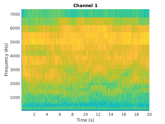 [audioIn,fs] = audioread('AudioArray-16-16-4channels-20secs.wav'); [S,cF,t] = melSpectrogram(audioIn,fs); S = 10*log10(S+eps); % Convert to dB for plotting for i = 1:size(S,3) figure(i) surf(t,cF,S(:,:,i),'EdgeColor','none'); xlabel('Time (s)') ylabel('Frequency (Hz)') view([0,90]) title(sprintf('Channel %d',i)) axis([t(1) t(end) cF(1) cF(end)]) end