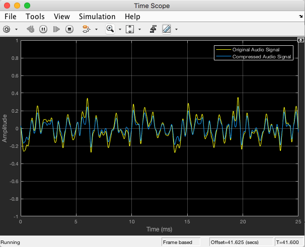 Чтобы сравнить динамический диапазон несжатых и сжатых сигналов, динамический диапазон вычислен и отображен на панели Отображения Модели Simulink. Форма волны несжатых и сжатых сигналов также построена в режиме реального времени.