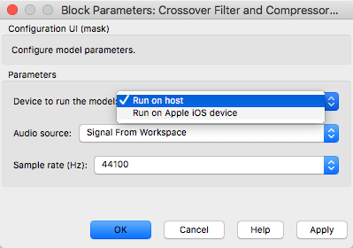 audiomultibandcompressoriOS модель является каскадом источников аудиосигналов, многополосным перекрестным фильтром, компрессорами и подсистемой отображения. Это обеспечивает выбор модели рабочее устройство (хост - компьютер или устройство на iOS) и источник аудиосигналов (Рабочее пространство MATLAB или микрофон). Можно выбрать настройку путем нажатия на Configuration UI кнопка.