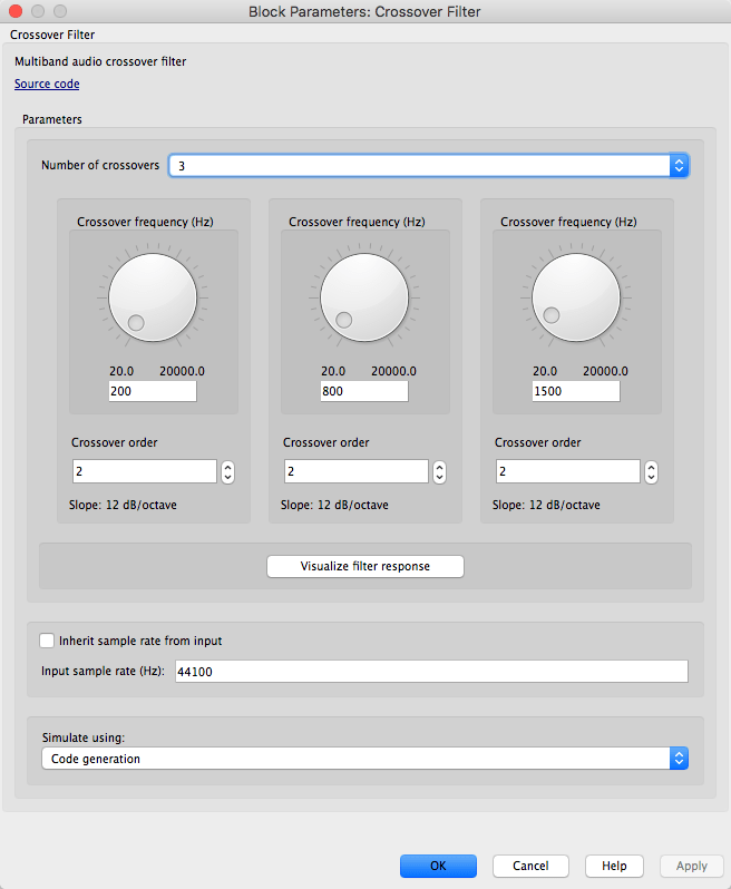 В этой модели вы используете блок Crossover Filter из Audio Toolbox. Можно открыть блок UI путем нажатия на Crossover Filter UI и измените частоты среза.