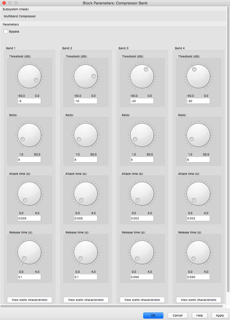 Многополосный компрессор в этом примере сначала разделяет звуковой сигнал в различные полосы, использующие многополосный перекрестный фильтр. Linkwitz-раздраженные перекрестные фильтры используются, чтобы получить полную allpass частотную характеристику. Каждая полоса затем сжата с помощью отдельного компрессора динамического диапазона. Ключевые характеристики компрессора, такие как порог, коэффициент сжатия, время атаки и время релиза являются независимо настраиваемыми для каждой полосы. Можно запустить модель или на хосте - компьютере или на устройстве на iOS Apple.