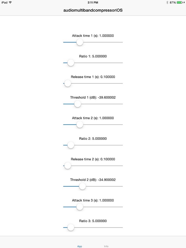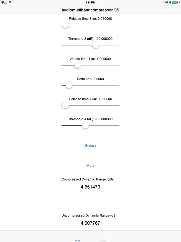 Можно принять решение сделать автономное приложение iOS путем нажатия на Deploy to hardware кнопка на панели инструментов Simulink Editor. После развертывания приложение может работать на вашем устройстве на iOS, даже когда это отключается от хоста - компьютера. Параметр компрессора, настраивающий пользовательский интерфейс и отображение динамического диапазона, спроектирован на вашем экране устройства на iOS, как показано ниже:
