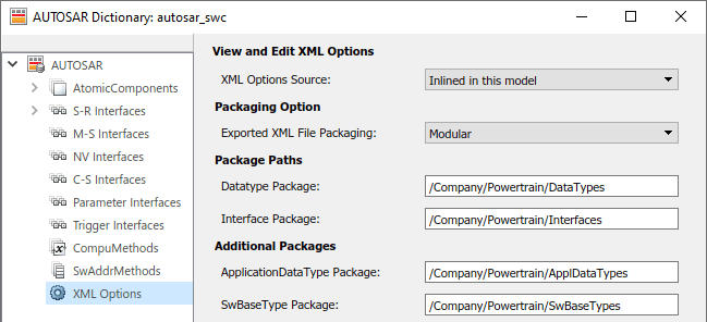 Прежде, чем сгенерировать код, откройте Словарь AUTOSAR и исследуйте настройки параметров экспорта AUTOSAR XML. На вкладке AUTOSAR выберите Code Interface> AUTOSAR Dictionary. В Словаре AUTOSAR выберите XML Options.