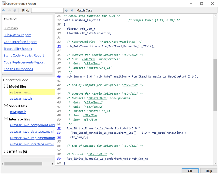 Чтобы сгенерировать описания программного обеспечения код С и XML AUTOSAR, которые выполняют Классические технические требования Платформы, создайте модель. В окне модели нажмите Ctrl+B. Процесс сборки генерирует код С и описания ARXML к папке сборки модели, autosar_swc_autosar_rtw. Когда сборка завершается, отчет генерации кода открывается.