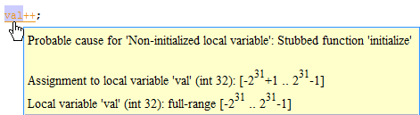 Если вы используете переменную после вызова функции, Polyspace полагает, что переменная может быть не инициализирована. Это производит оранжевый Non-initialized local variable, проверяют переменную.
