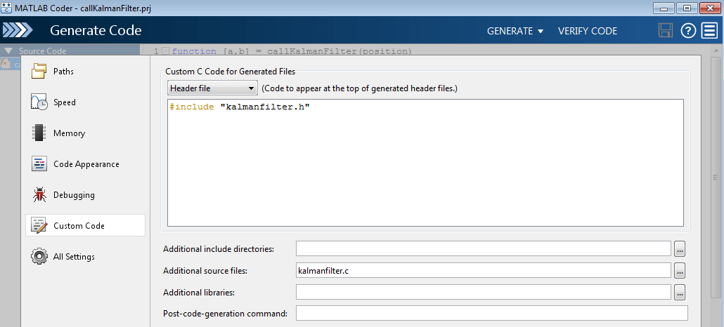 cfg.CustomSource = 'kalmanfilter.c'; cfg.CustomHeaderCode = '#include "kalmanfilter.h"';