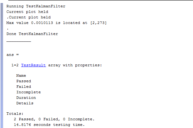 TestKalmanFilter тесты, превышает ли ошибка между предсказанным положением и фактическим положением заданный допуск. Модульные тесты являются модульными тестами, основанными на классах. Для получения дополнительной информации смотрите Создание модульных тестов на основе классов в MATLAB.