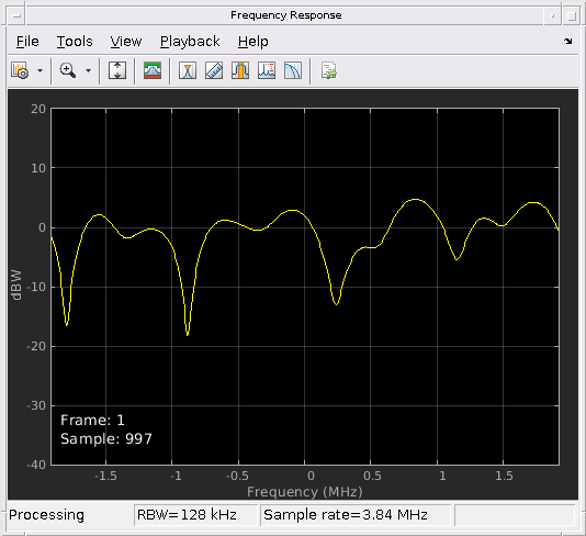 Осциллограф частотной характеристики отображает многопутевой спектр Канала с релеевским замиранием путем взятия дискретного преобразования Фурье коэффициентов фильтра канала. График частотной характеристики совместно использует ту же панель инструментов и меню как dsp.SpectrumAnalyzer Системный объект.