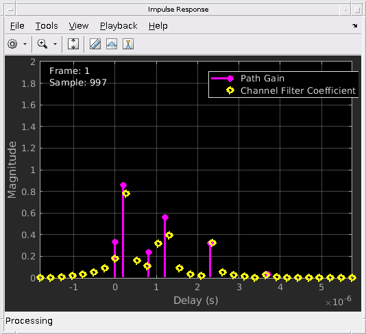 Осциллограф импульсной характеристики отображает усиления пути, коэффициенты фильтра канала и интерполированные усиления пути. Усиления пути происходят в экземплярах времени, которые соответствуют заданному PathDelays свойство и не может быть выровнено с входным временем выборки. Коэффициенты фильтра канала используются, чтобы смоделировать канал. Они интерполированы от фактических усилений пути и выравниваются с входным временем выборки. В случаях, в которых усиления пути выравниваются со временем выборки, усиления пути перекрывают коэффициенты фильтра. Интерполяция Sinc используется, чтобы соединить коэффициенты фильтра канала и показывается интерполированными усилениями пути. Эти точки используются только для целей отображения и не используются в последующей фильтрации канала. Для плоского исчезающего канала (один путь), не отображена sinc кривая интерполяции. Для всех графиков импульсной характеристики систему координат и демонстрационные числа показывают в верхнем левом углу осциллографа.