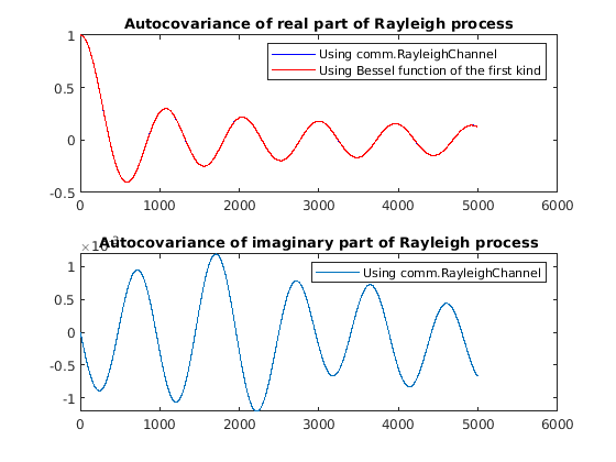 subplot(2,1,1) plot(autocov_normalized_real,'b-') hold on plot(Rrr_normalized,'r-') hold off legend('Using comm.RayleighChannel','Using Bessel function of the first kind') title('Autocovariance of real part of Rayleigh process') subplot(2,1,2) plot(autocov_normalized_imag) legend('Using comm.RayleighChannel') title('Autocovariance of imaginary part of Rayleigh process')