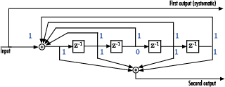 Бинарный вектор [1 1 1 1 1] представляет восьмеричные 37 и соответствует верхней строке двоичных цифр в схеме. Бинарный вектор [1 1 0 1 1] представляет восьмеричные 33 и соответствует более низкой строке двоичных цифр в схеме. Эти двоичные цифры указывают на связи от выходных параметров регистров к этим двум сумматорам в схеме. Начальный 1 соответствует входному биту.