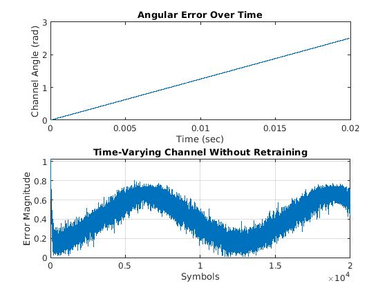График показывает чрезмерные ошибки вне этих 1 000 периодов подготовки символов. Когда демодуляция символов и вычислительных ошибок символа, с учетом не сходившегося выхода и системной задержки между эквалайзером выход и переданными символами, пропускает первые 2 000 символов.